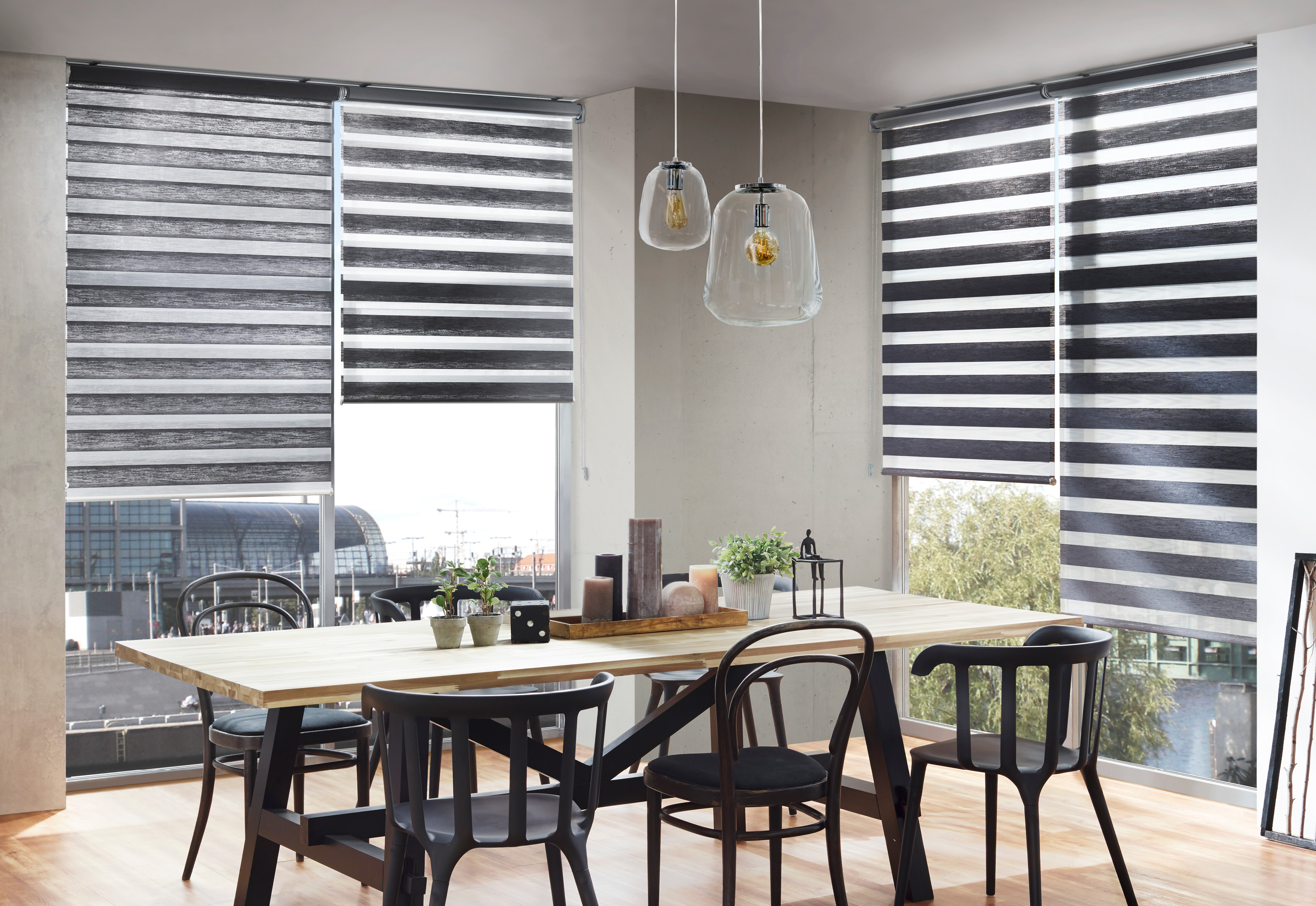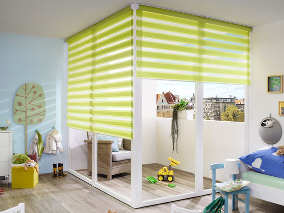 The double roller blind is an extravagant alternative to the roller blind – a real quick-change artist at the window. The exclusive fabric is characterized by the alternately changing opaque and transparent stripes.