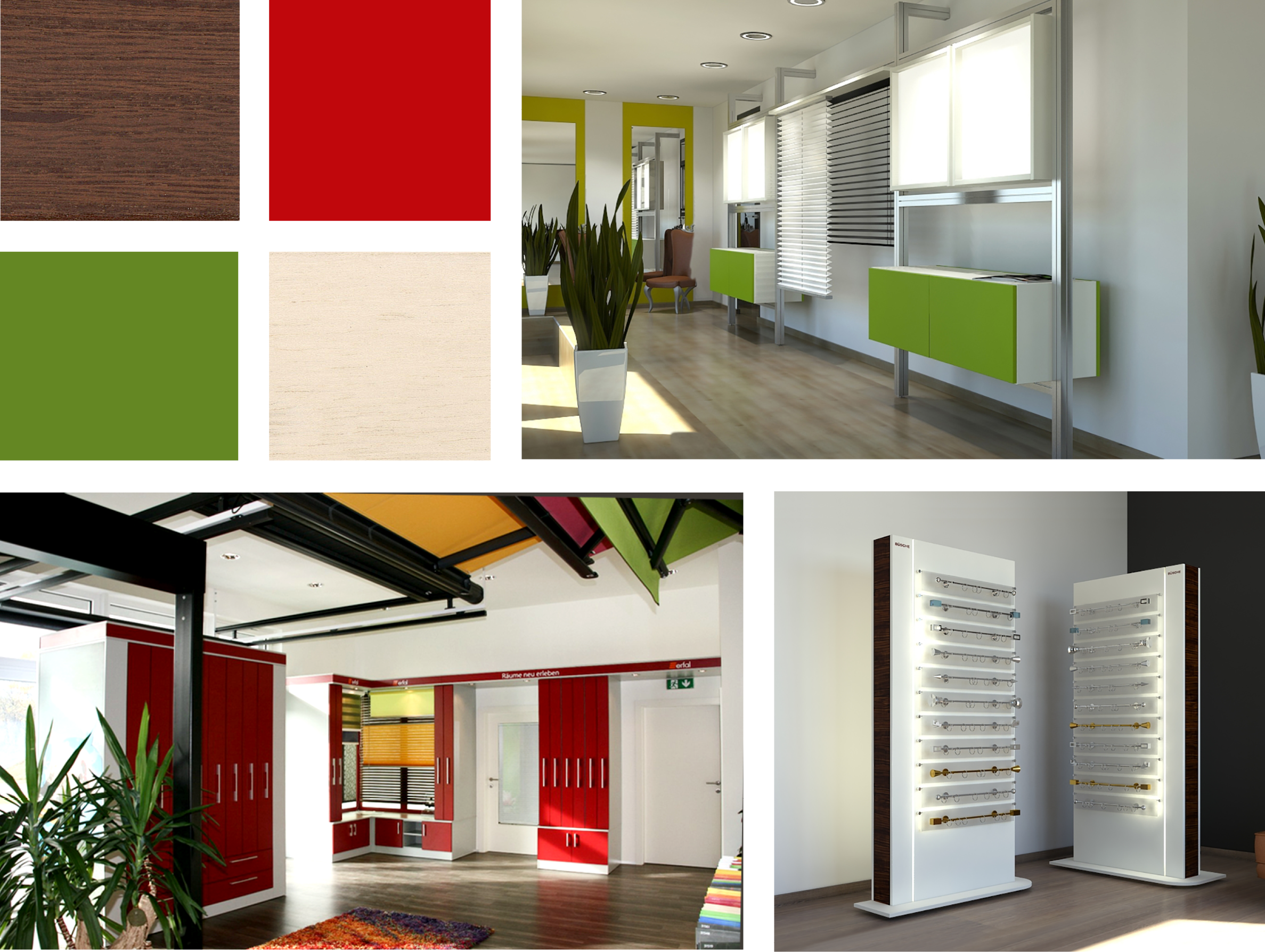 Mit hochwertigen Materialien und einem abgestimmten Beleuchtungskonzept kommen die Raumausstattungs-Produkte optimal zur Geltung. Für die Ladeneinrichtungen können diverse Gestaltungselemente gewählt und kombiniert werden: verschiedene Holzdekore, Hochglanzoberflächen, Metall und Glas.