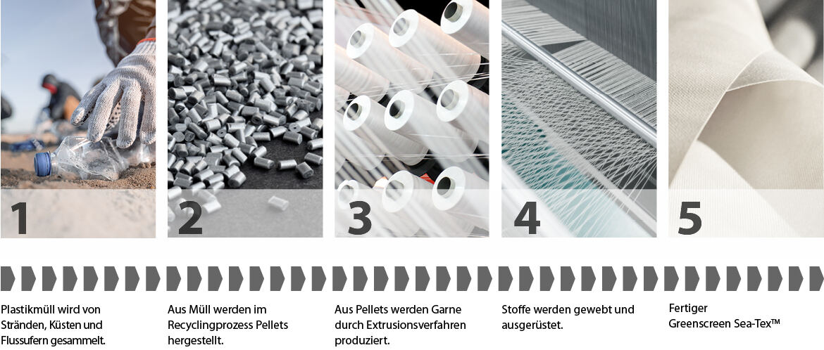 Hochwertige Textilien aus angespülten Kunststoffmüll entwickelt Hunter Douglas in Zusammenarbeit mit Bionic® Yarn für die Produktpalette von Greenscreen Sea-Tex. Bei dem von Bionic® entwickeltem Recyclingprogramm wird Plastikmüll von Stränden, abgelegenen Küsten und Flussufern gesammelt, sortiert und neu verarbeitet.