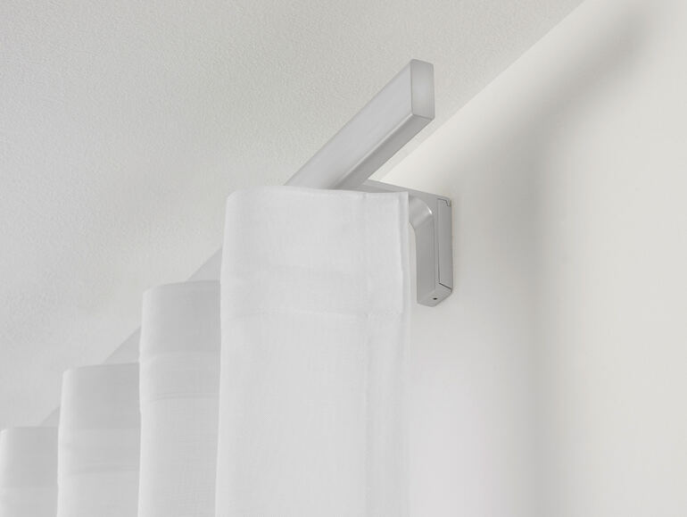 Mit den fast unsichtbaren Deckenträgern oder stilistisch minimierten Wandwinkeln werden Sie jeder Montagevariante gerecht. Alle FLOW-Systeme haben einen verdeckten Laufkanal, der die Gardine scheinbar schweben lässt. Die bündigen Endkappen nehmen jeweils die Form des Profils auf und verleihen einen harmonischen Eindruck bis zum Schluss.